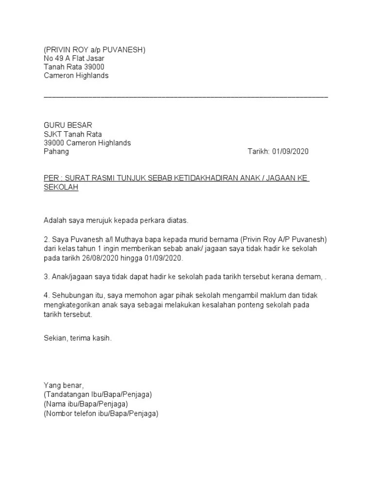 Surat tidak hadir ke sekolah contoh rasmi sebab .